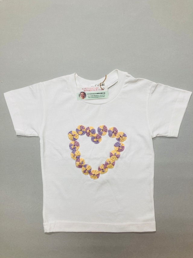 かわいいハート模様のカンボジアのお母さんの手作りTシャツです。 ハートはカンボジアのクロマーという布を使っています! 綿100% Sサイズ 100〜110 2歳〜4歳 肩幅31cm 身幅31cm 着丈40cm Mサイズ 110〜120 5歳〜7歳 肩幅32cm 身幅36cm 着丈45cm