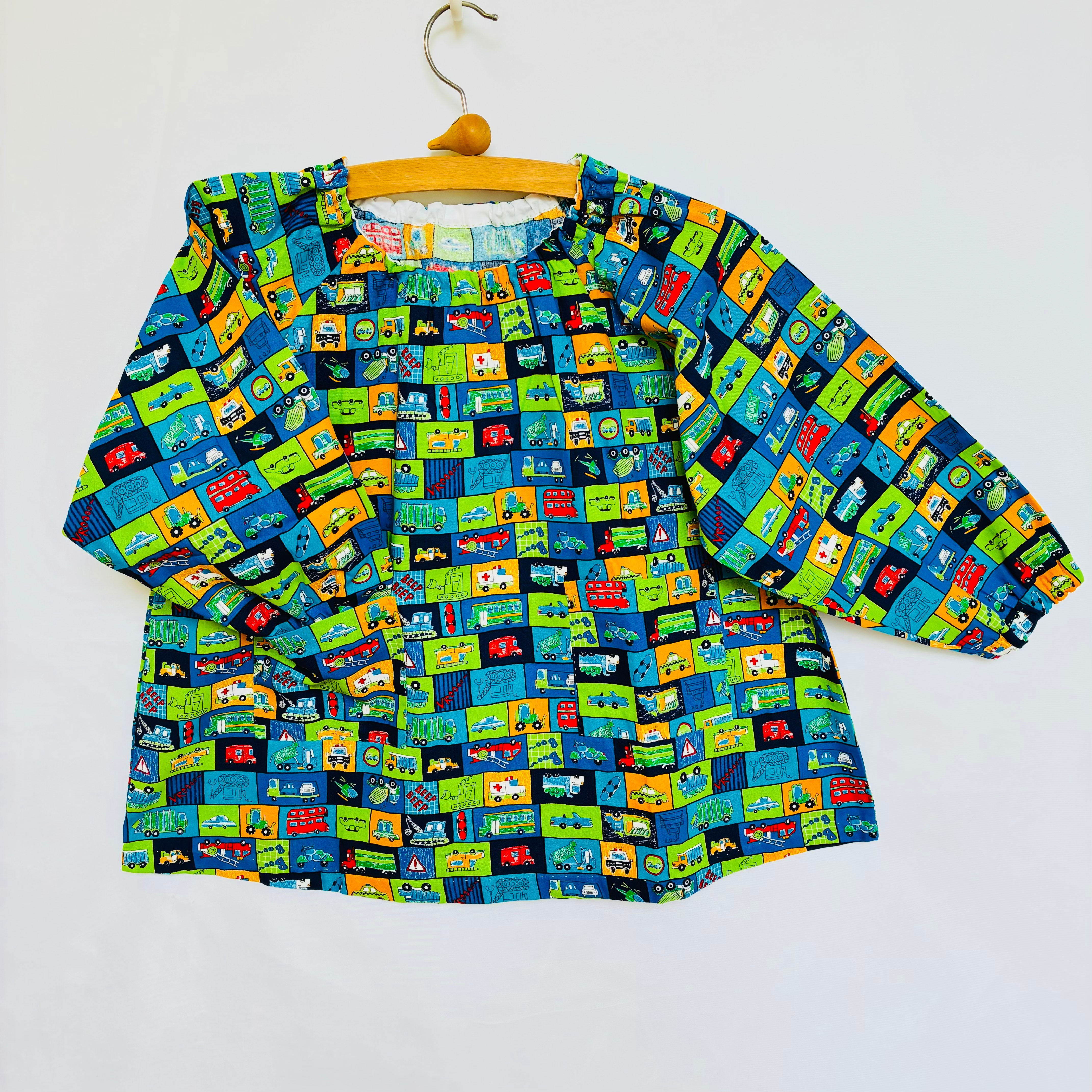 長袖スモック110(身丈43cm) 乗り物大集合 紺と黄緑のスクエア_251029
