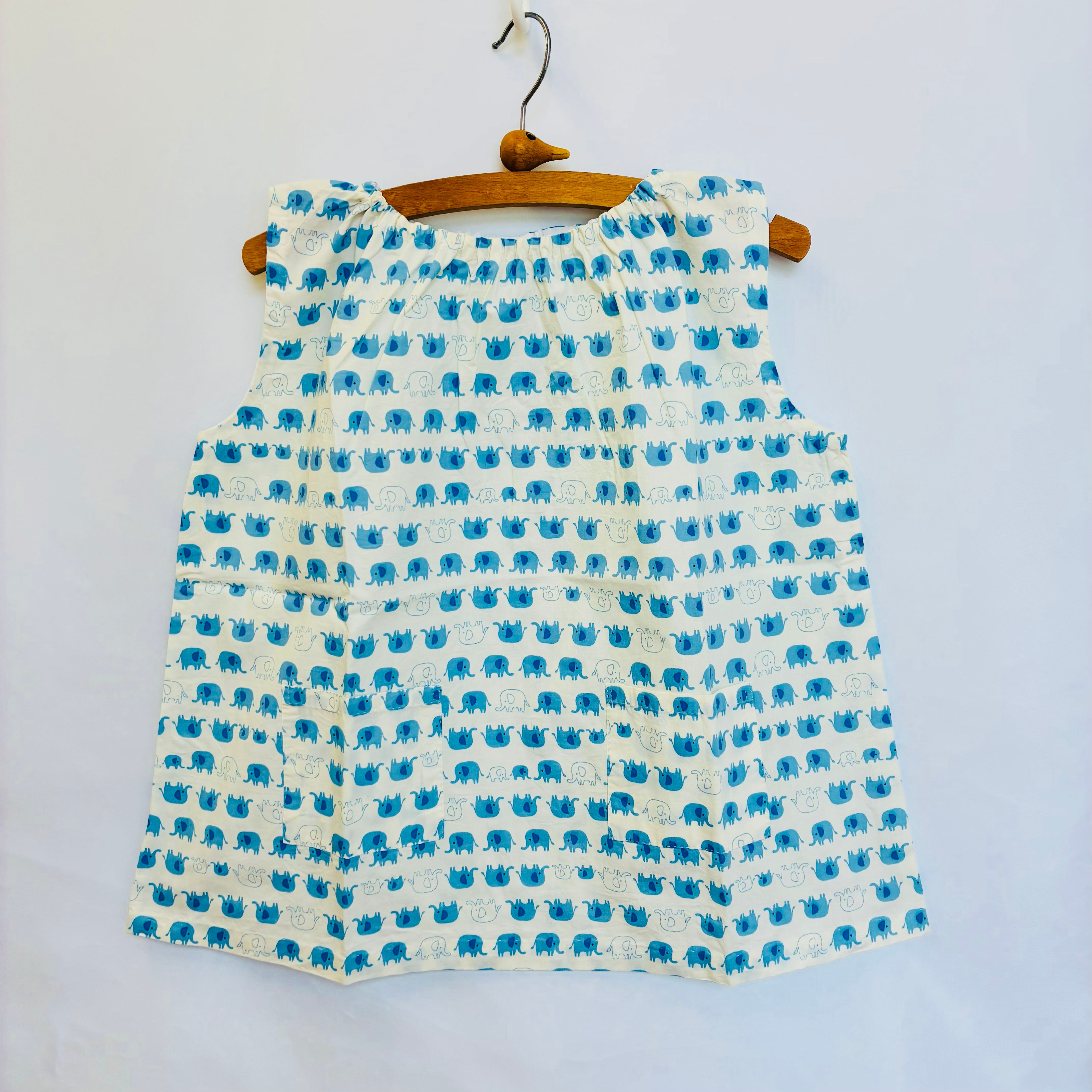 袖なしスモック120cm 並んだ象さん 白地に水色_251029