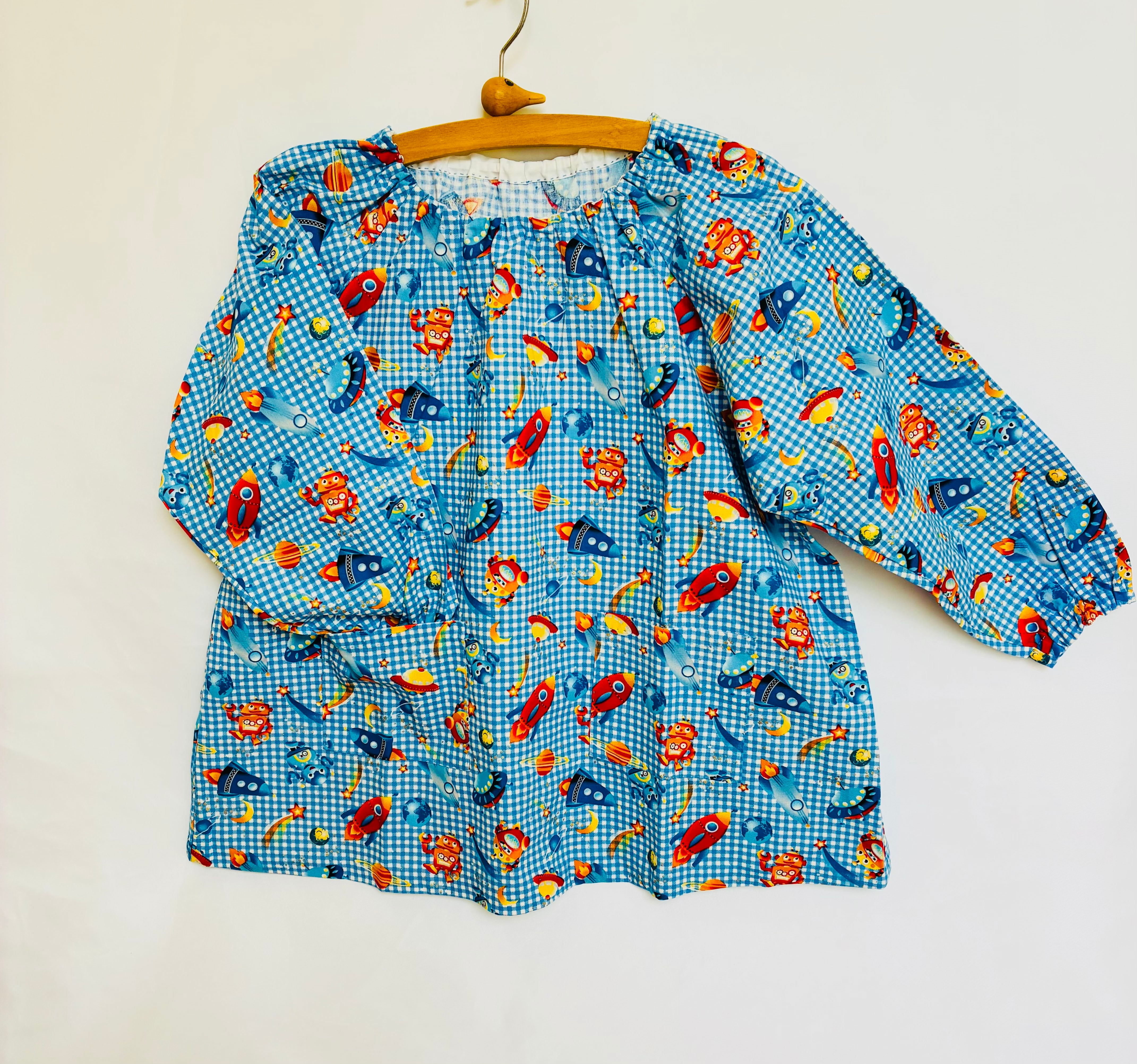 長袖スモック120(身丈49cm) 宇宙探検ロボット 青チェック_251029