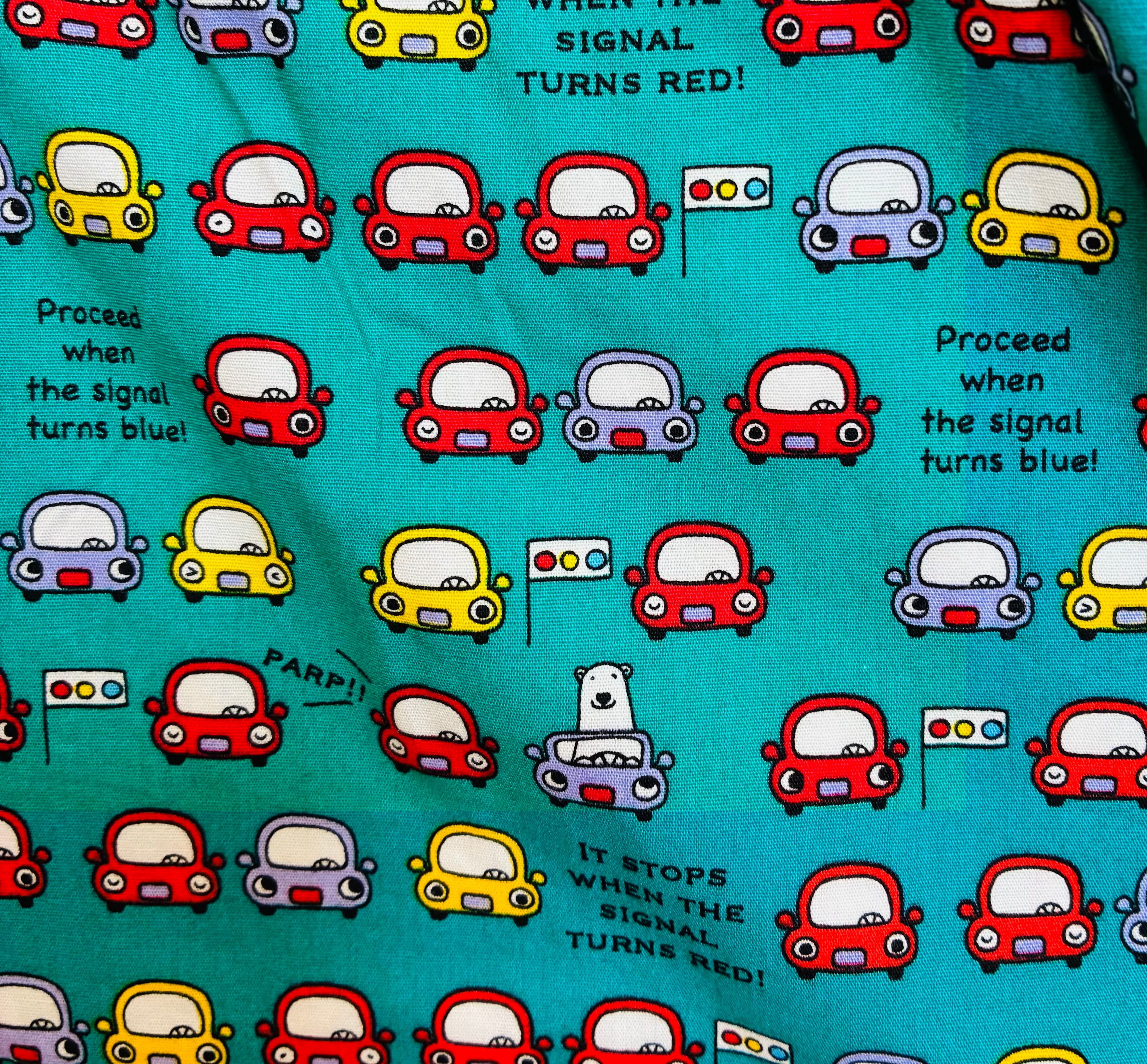 長袖スモック120(身丈49cm) 前を向いて並んだ自動車 緑_251029