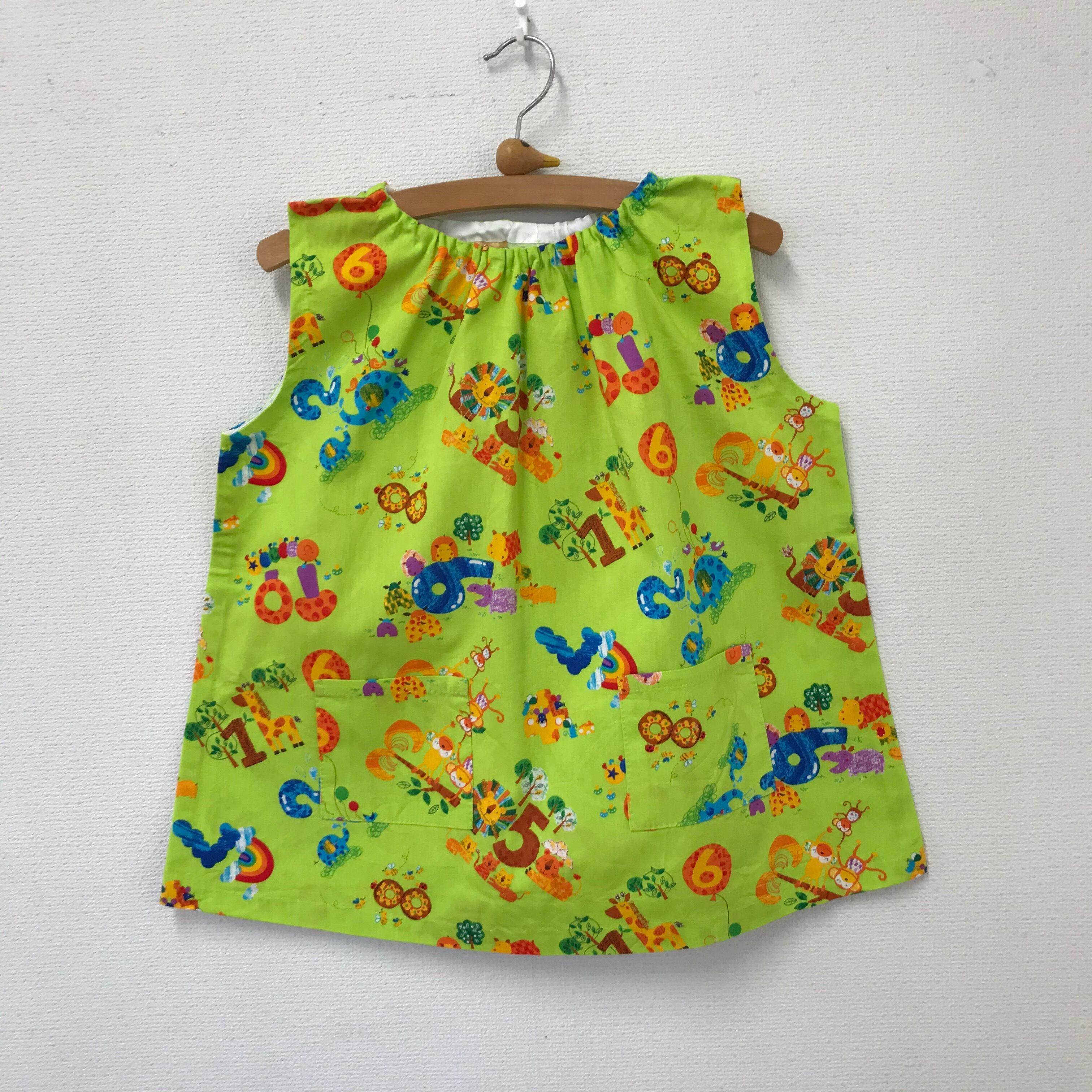 袖なしスモック120cm 明るいきみどり 動物と数字