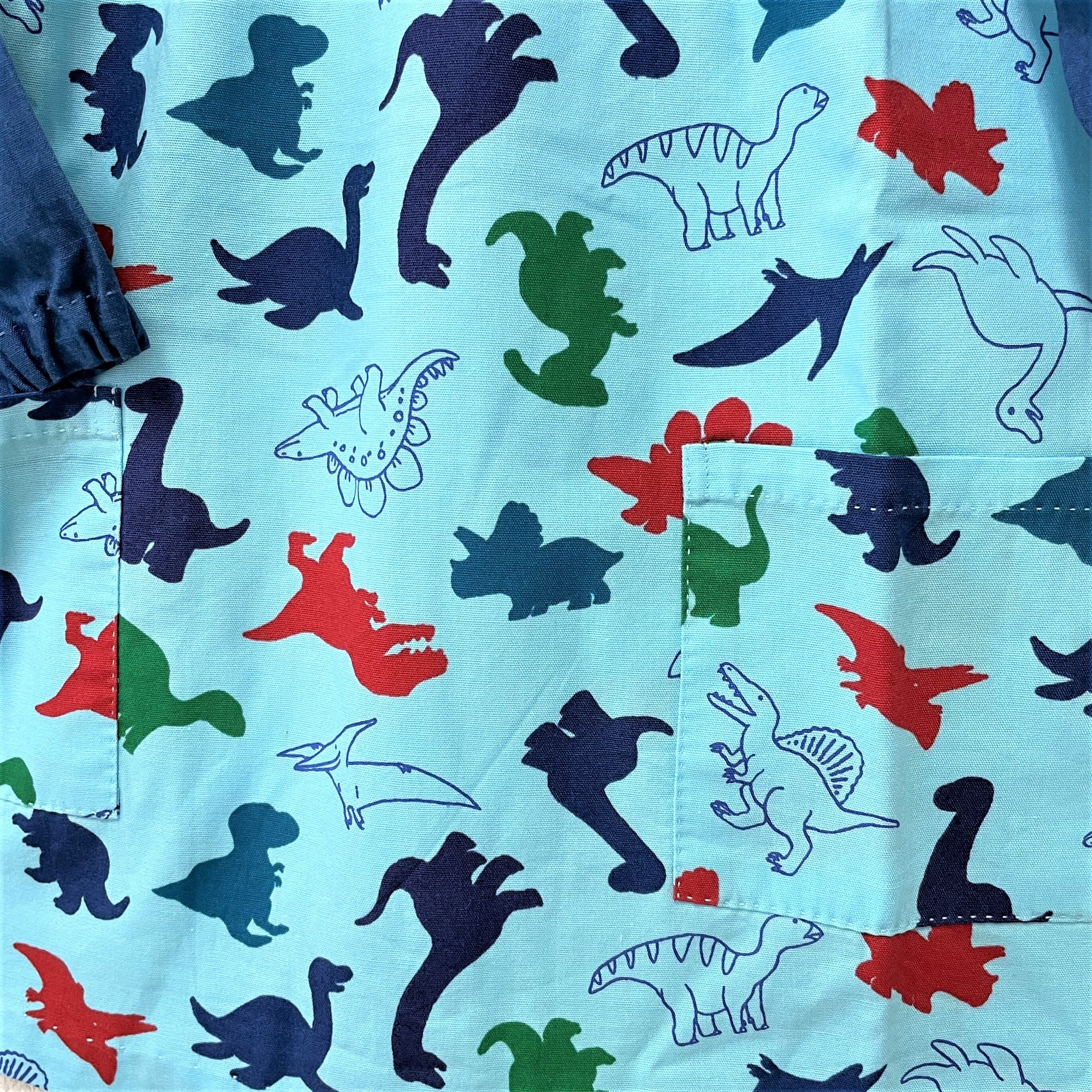 長袖スモック110(身丈43cm) 袖紺、見ごろ水色に恐竜