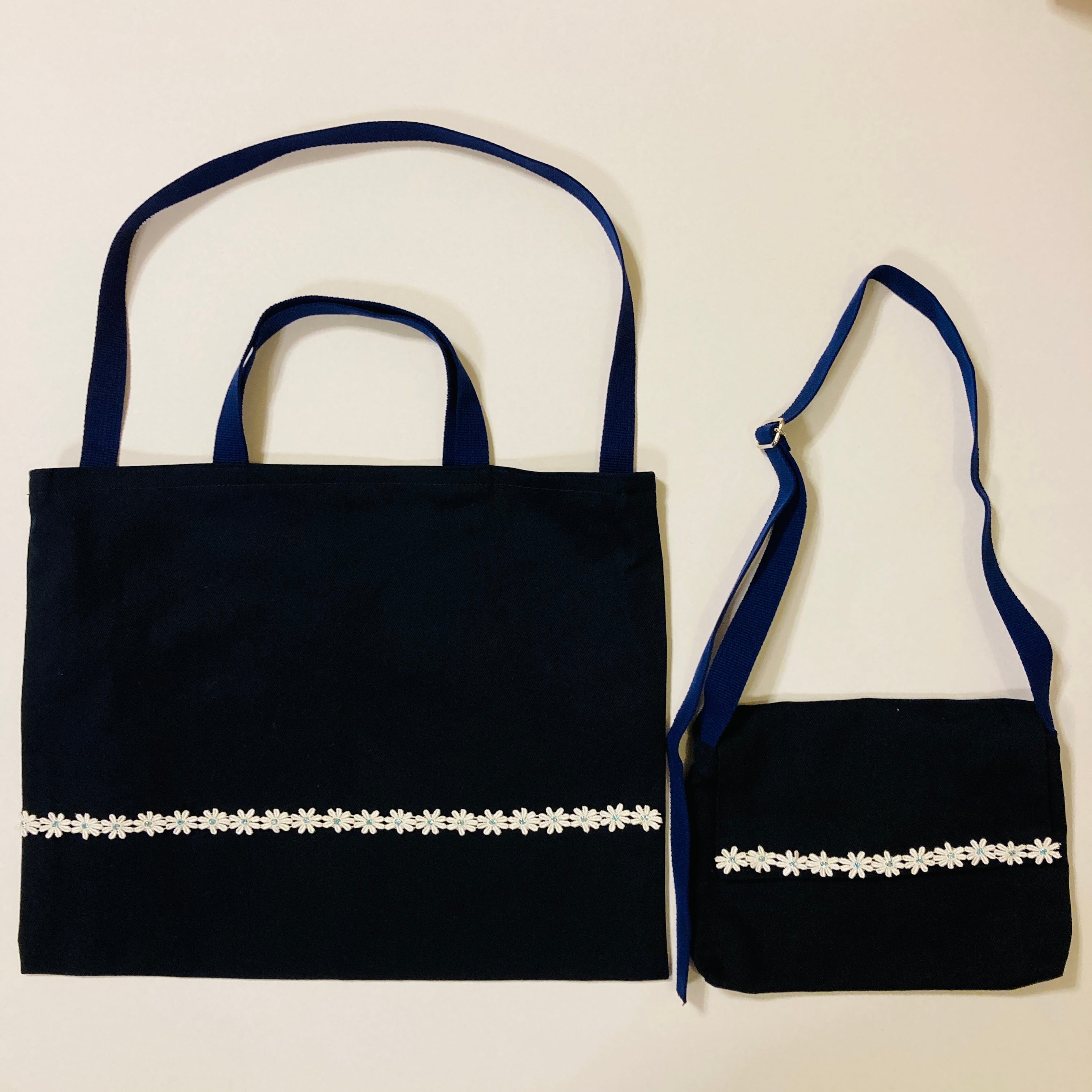 ★セット★手提げ・礼拝バック(小学部) 新作 ブルーラインストーンの小花